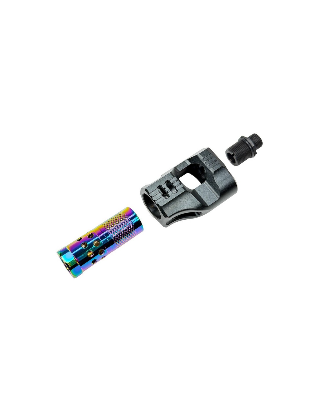 This compensator has been designed specifically for Hi-Capa platforms, with a completely original approach in terms of both aesthetics and functionality. It is installed using an adapter system and is compatible with Hi-Capas whose external barrel has internal threading. Functionally, it also allows a longer internal barrel to be concealed inside the compensator, making it easier to optimise long-range performance without altering the overall appearance of the replica.
