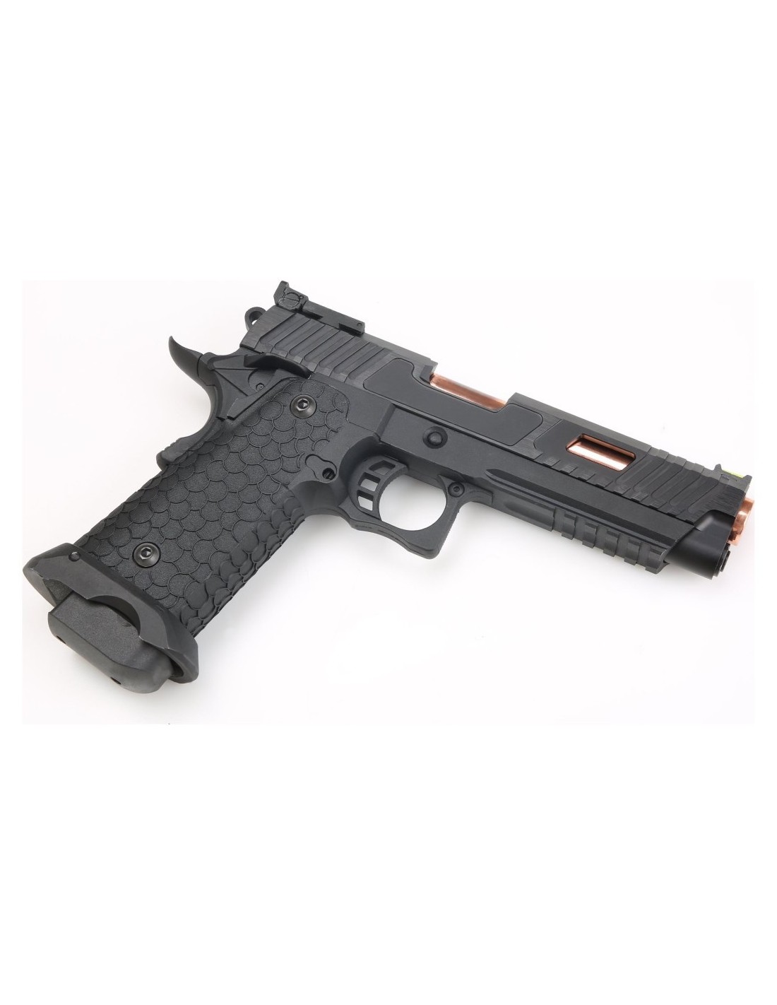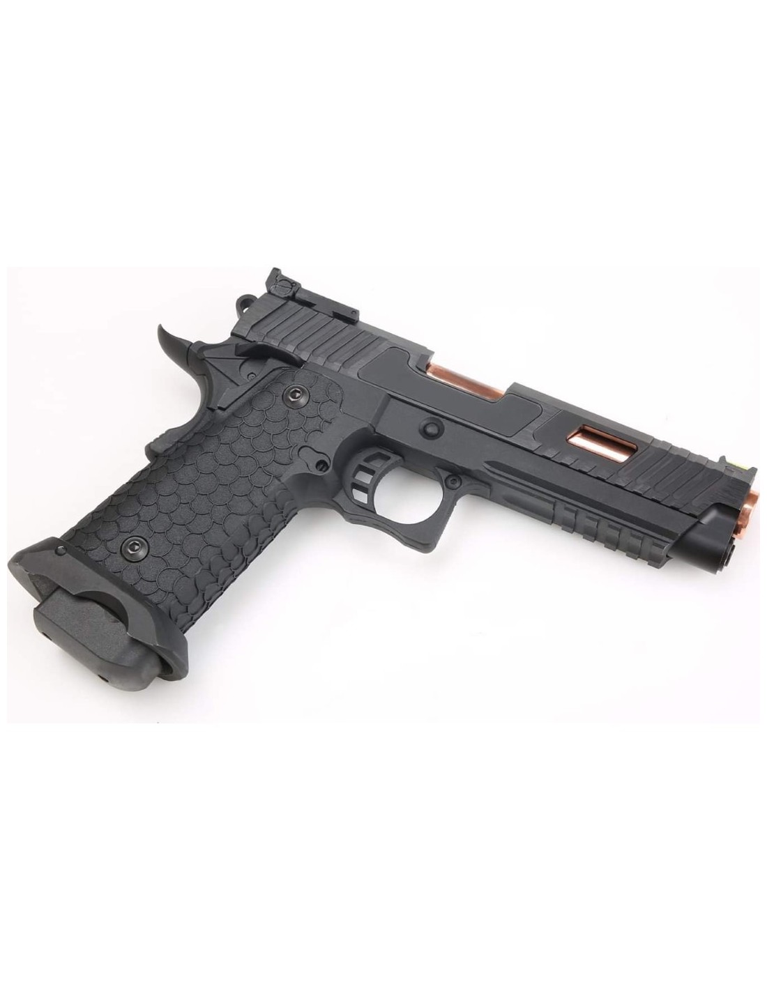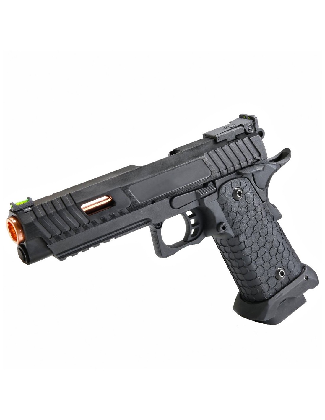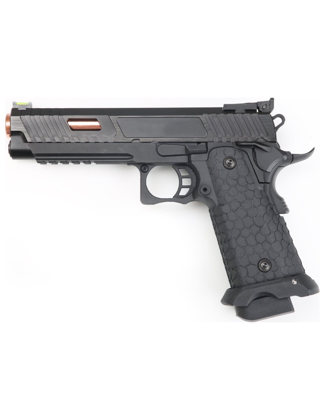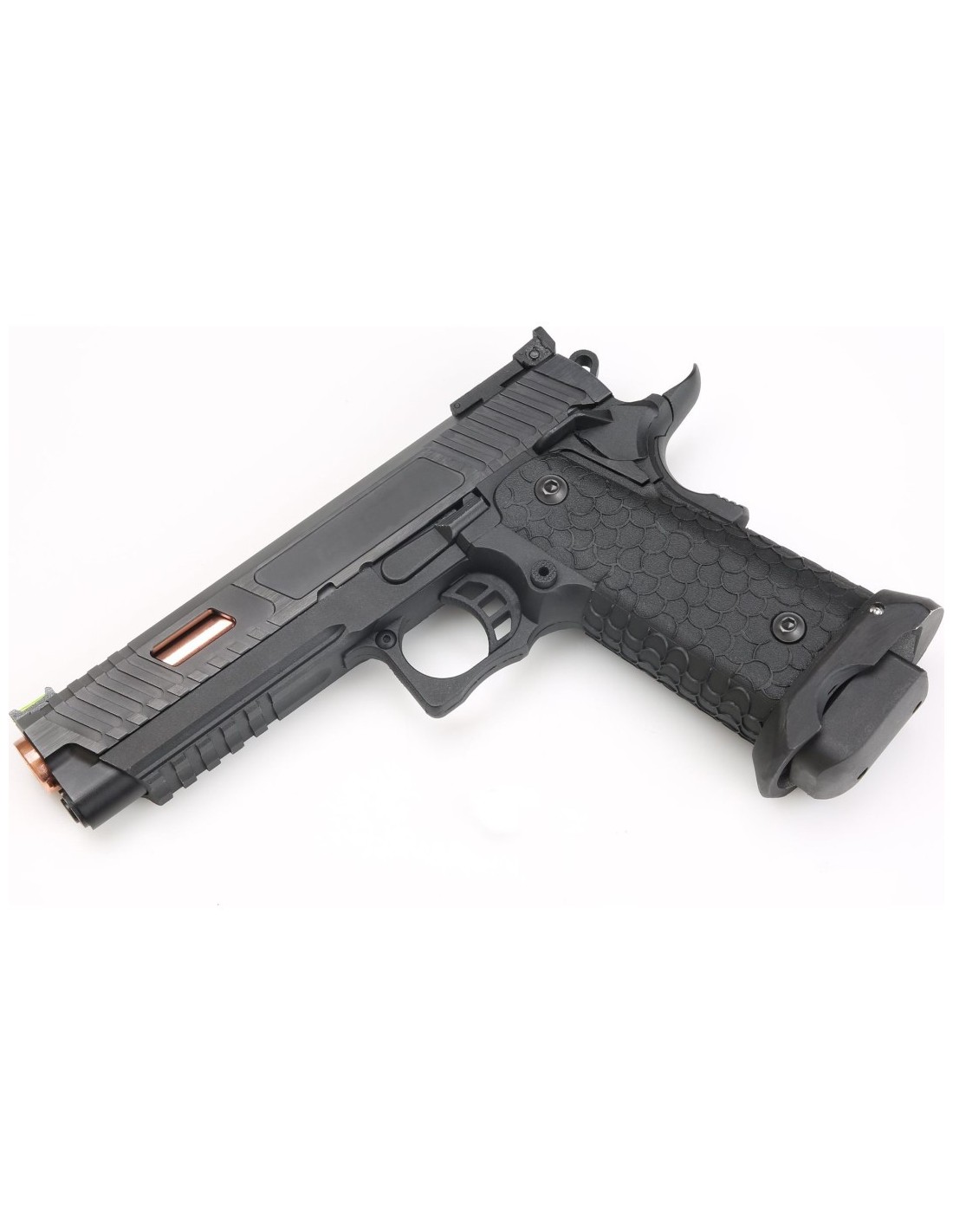The JW3 STI Combat Master is the culmination of the ultimate competition pistol platform combined with master levels of tuning to create a handgun like no other. Wielded by Baba Yaga himself, this is the pistol used by John Wick in the 2019 film John Wick 3: Parabellum. Based on an STI 2011, the JW3 STI Combat Master is expertly crafted with slide lightening cuts to improve the cyclic speed and reduce perceived recoil. The forward swept front and rear slide serrations give a solid purchase for weapon manipulation. The extended magazine release helps with dropping the magazine without breaking your grip for faster reloads. The double undercut trigger guard lets you choke up higher on the gun for better recoil control. The large flared magwell assists with magazine insertion, helping to guide the magazine into the firearm. The grip stippling helps the shooter get a good purchase on the pistol and maintain a solid hold. The tuned trigger has an incredibly light pull and crisp break. The match grade coated barrel offers unmatched accuracy, consistency, and reliability. Other features include a full length, stainless steel guide rod and fiber optic front sight with adjustable target rear sight.