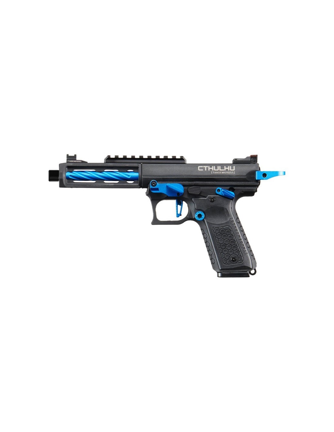 Discover the new Tandemkross CTHULHU gas pistol. Made of reinforced polymer, this semi/full auto GBB benefits from a fully licensed design. This replica is equipped with an innovative "Game Changer Pro" square compensator, a CNC thumb rest, and a "skeleton" trigger. In addition, the Tandemkross Hivegrip ensures a solid grip. With a "Halo" loading ring and "Eagle Eye" fiber optic sights, this pistol offers unmatched accuracy. The 24-round magazine and adjustable hop-up reinforce its versatility.