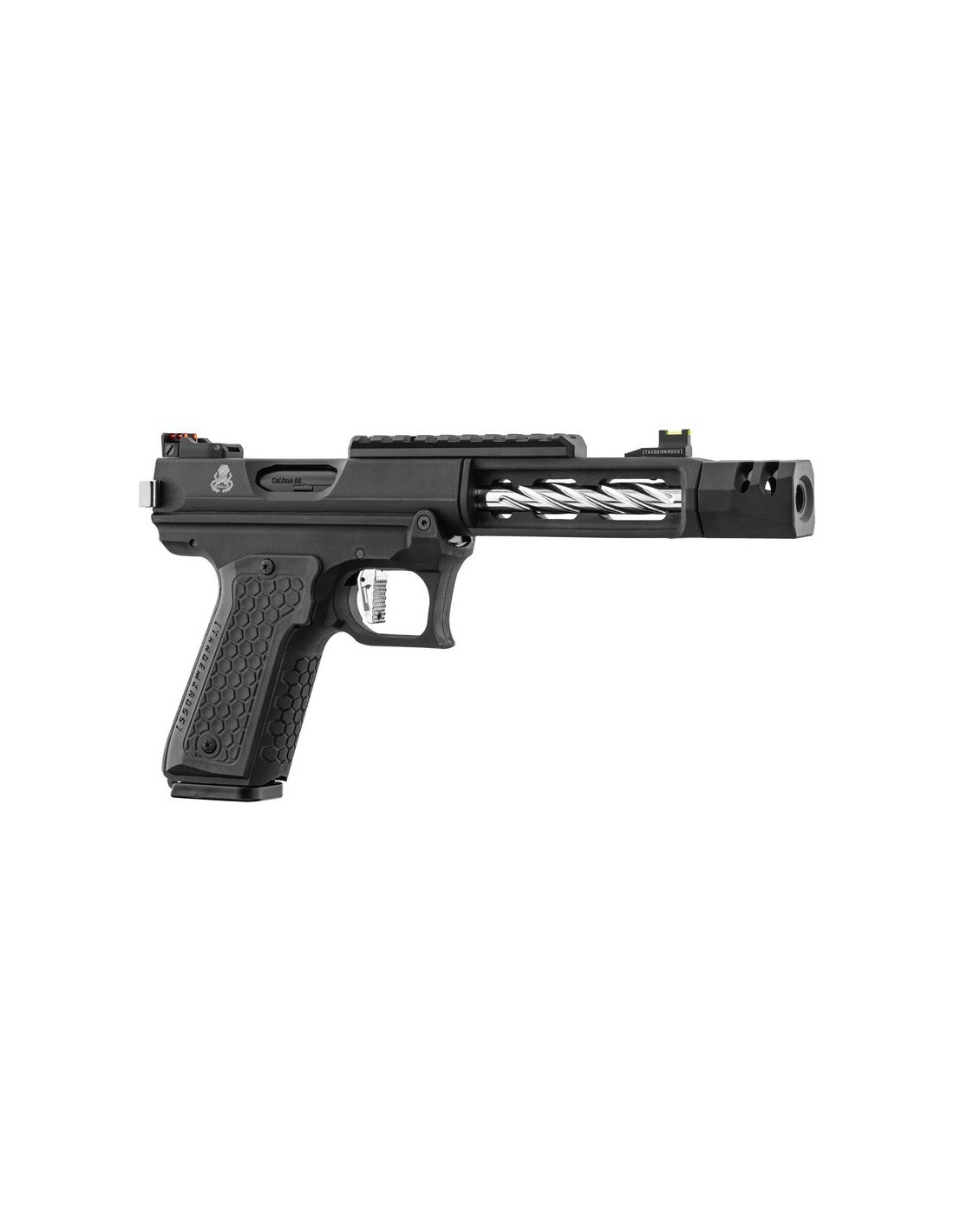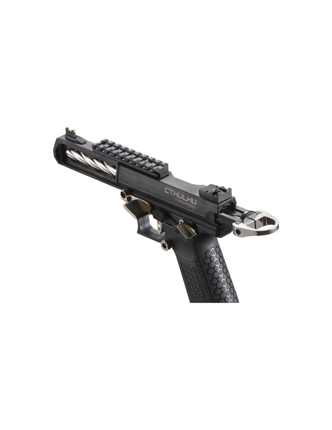 Discover the new Tandemkross CTHULHU gas pistol. Made of reinforced polymer, this semi/full auto GBB benefits from a fully licensed design. This replica is equipped with an innovative "Game Changer Pro" square compensator, a CNC thumb rest, and a "skeleton" trigger. In addition, the Tandemkross Hivegrip ensures a solid grip. With a "Halo" loading ring and "Eagle Eye" fiber optic sights, this pistol offers unmatched accuracy. The 24-round magazine and adjustable hop-up reinforce its versatility.
