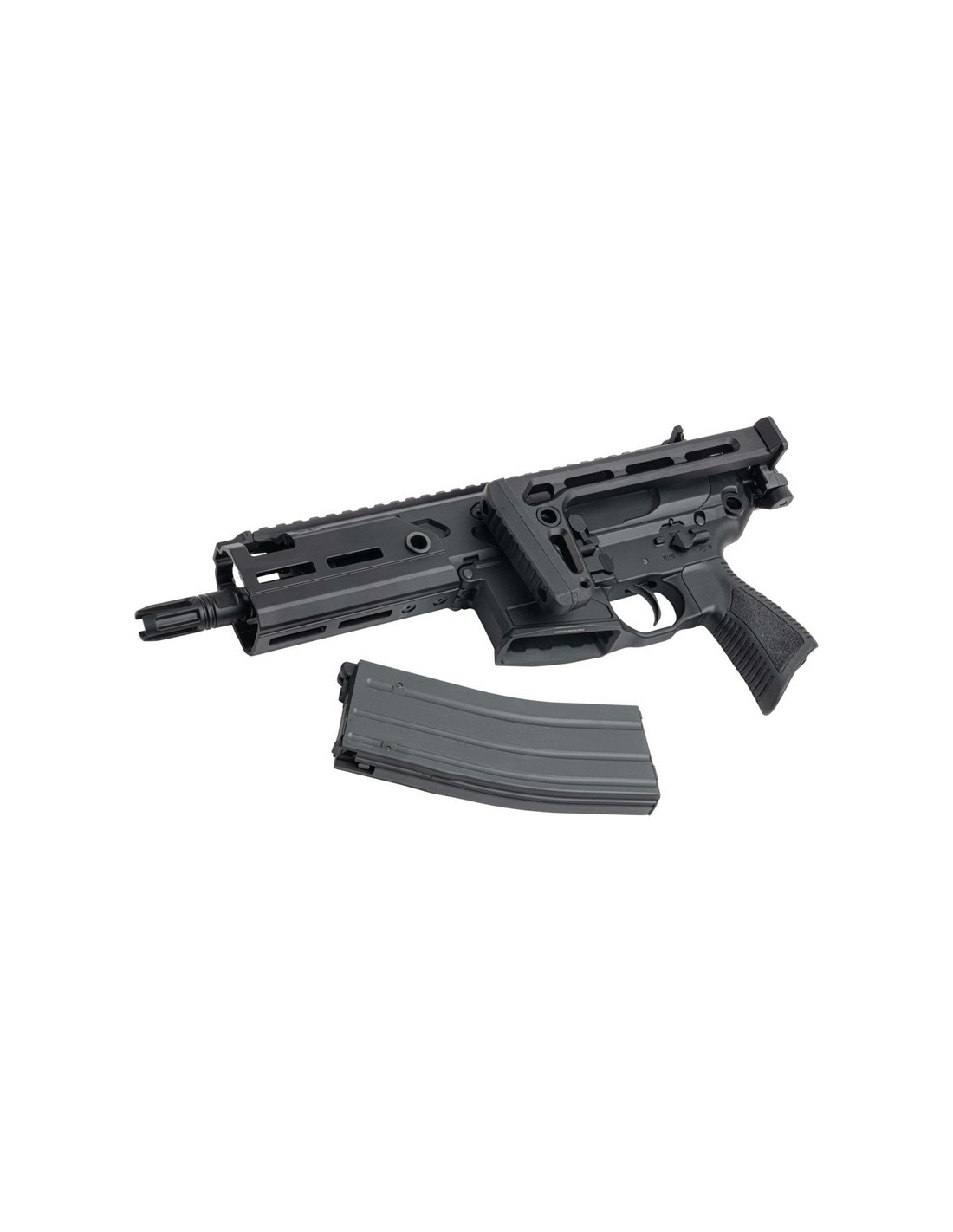 - Equipped with a minimalist stainless steel folding stock, unique PDW pistol grip and 3-prong conical QD flash hider