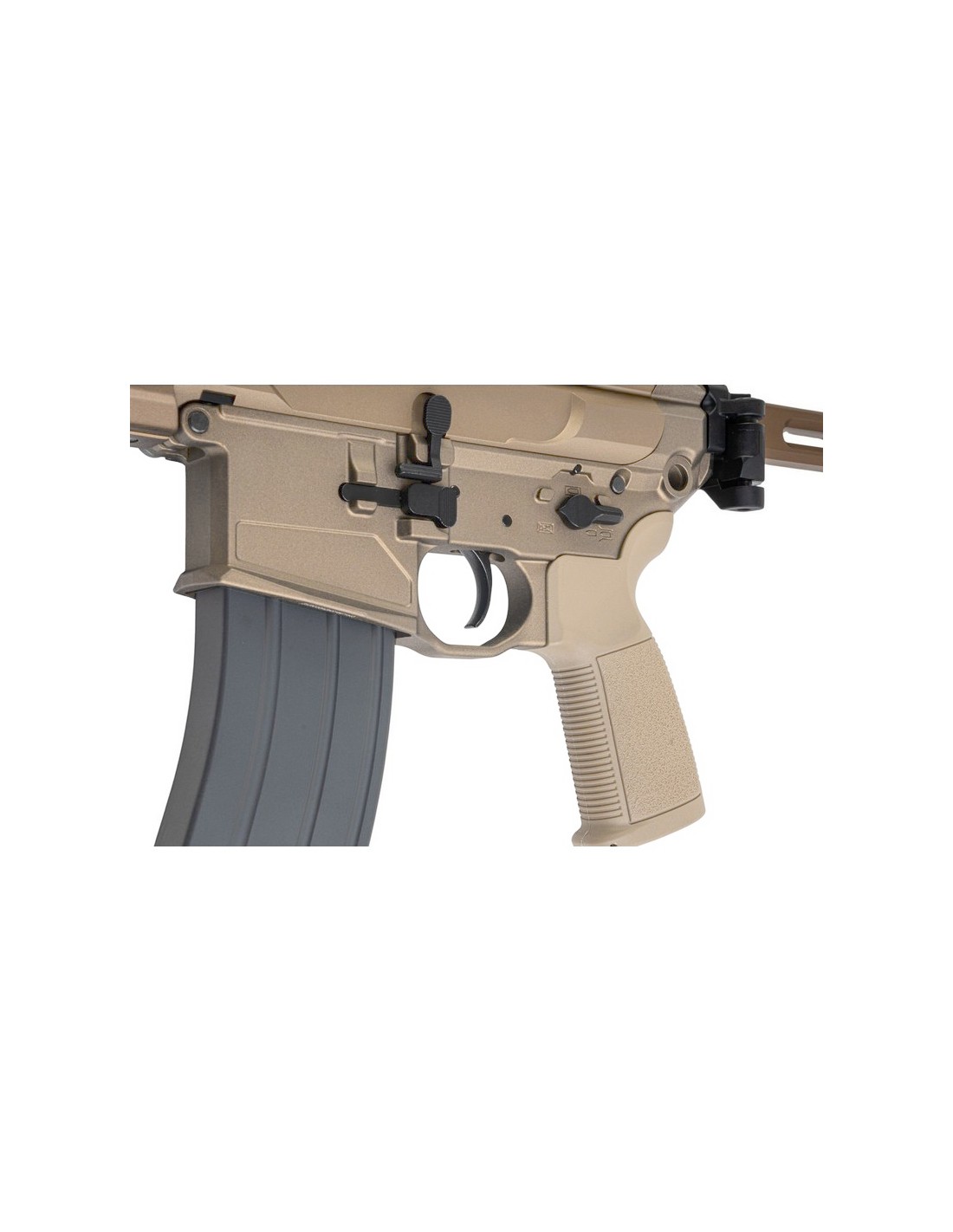 - Ambidextrous fire selector, cocking handle and mag release.