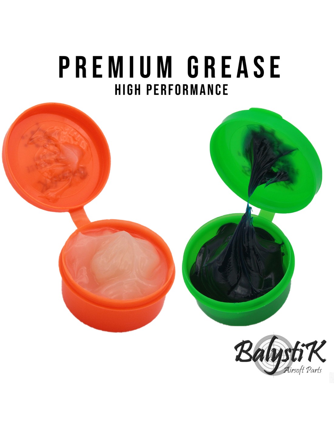 Balystik grease pack, including two jars of approximately 35g, 1 jar of MECHANICAL grease (orange) and 1 jar of PNEUMATIC grease (green). Affordable and convenient, it will allow you to be prepared for every need and every type of operation on your replica's internals.