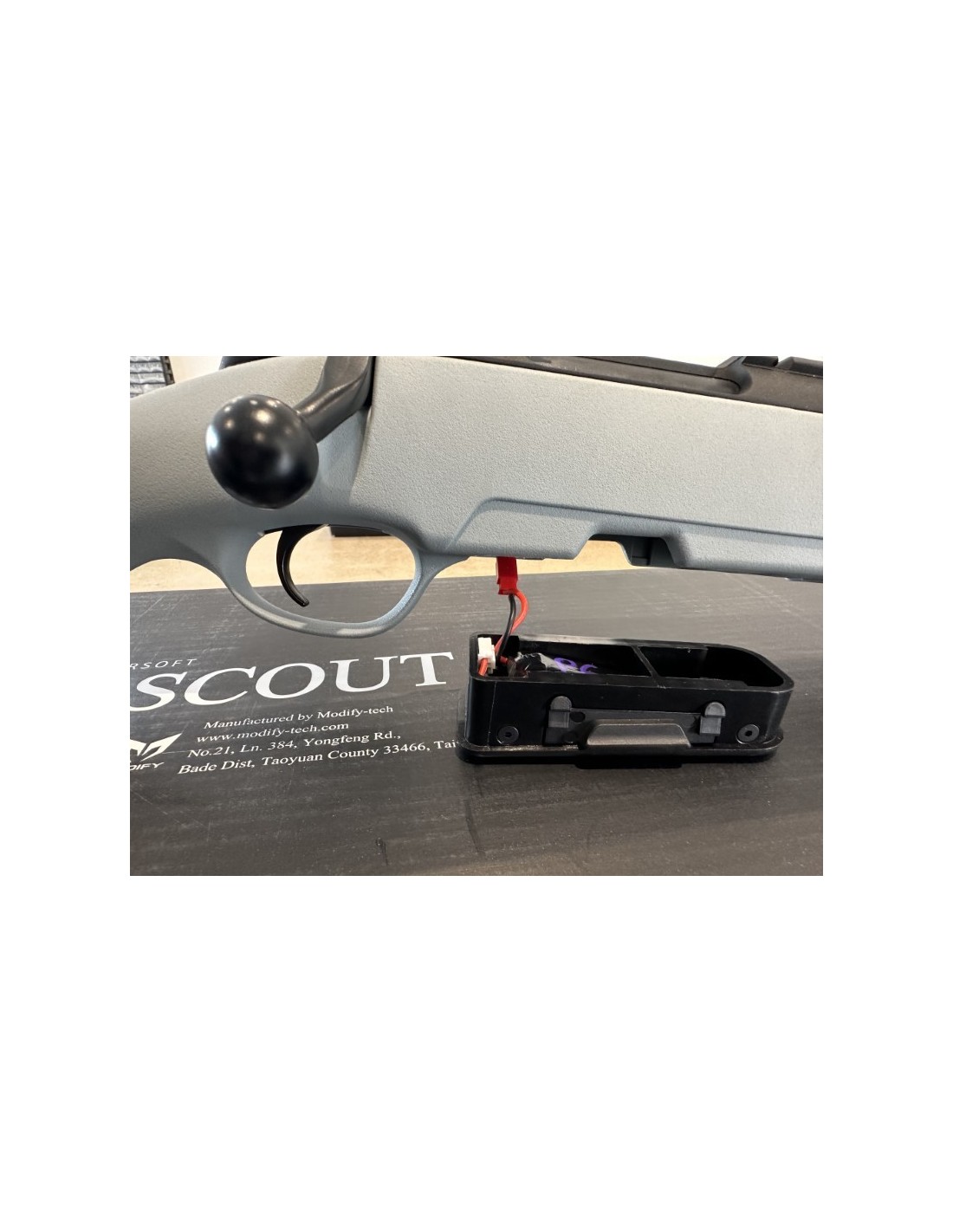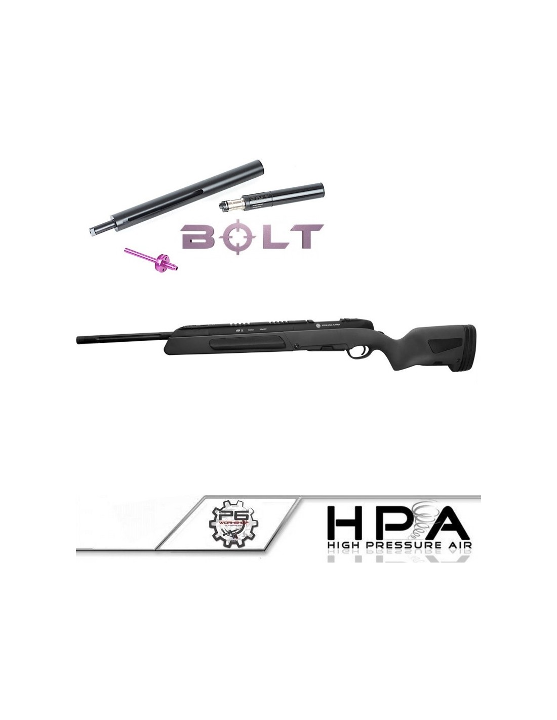 The P6 workshop present this magnificent HPA Steyr Scout equipped with a Wolverine Bolt system. With the installation of the HPA system, this sniper enters to another dimension ! Many modifications have been made to achieve this conversion because basically the ASG Steyr Scout is not compatible with the Wolverine Electrical Bolt system.