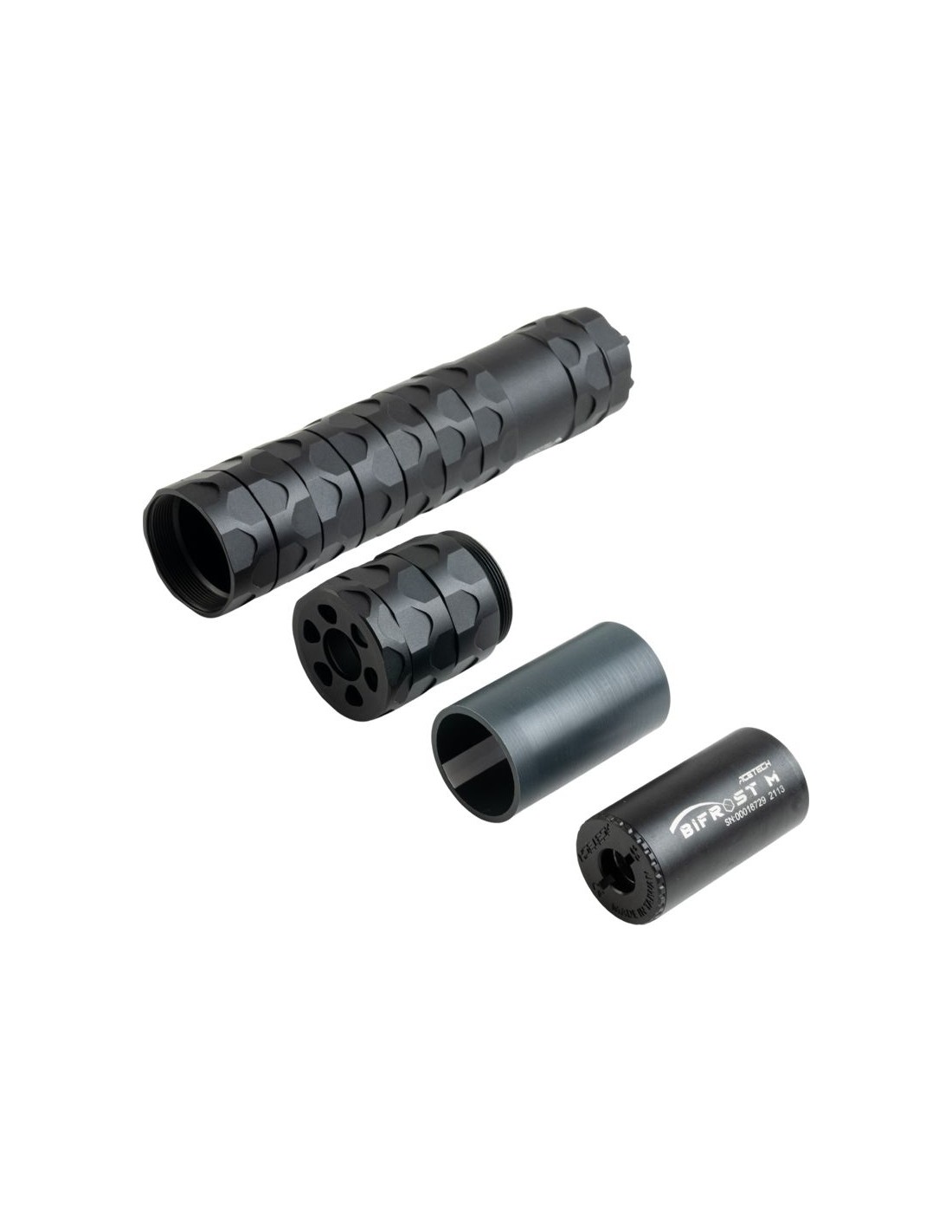 Fully licensed by Lone Wolf Arms and featuring official Elimin8r .45 markings, this suppressor faithfully replicates the Lone Wolf Elimin8r design while utilizing a modular, variable-length architecture with eight possible configurations. The suppressor body is engineered to accept tracer modules, with a tracer-compatible housing and included O-rings to ensure precise alignment of various tracer units. Overall length can be configured to suit different platforms, with full compatibility across 14 mm CCW outer barrel threading. The baffles use a uniform CCW thread, ensuring optimal axial alignment and controlled tension during assembly. The package includes an Acetech Bifrost tracer.