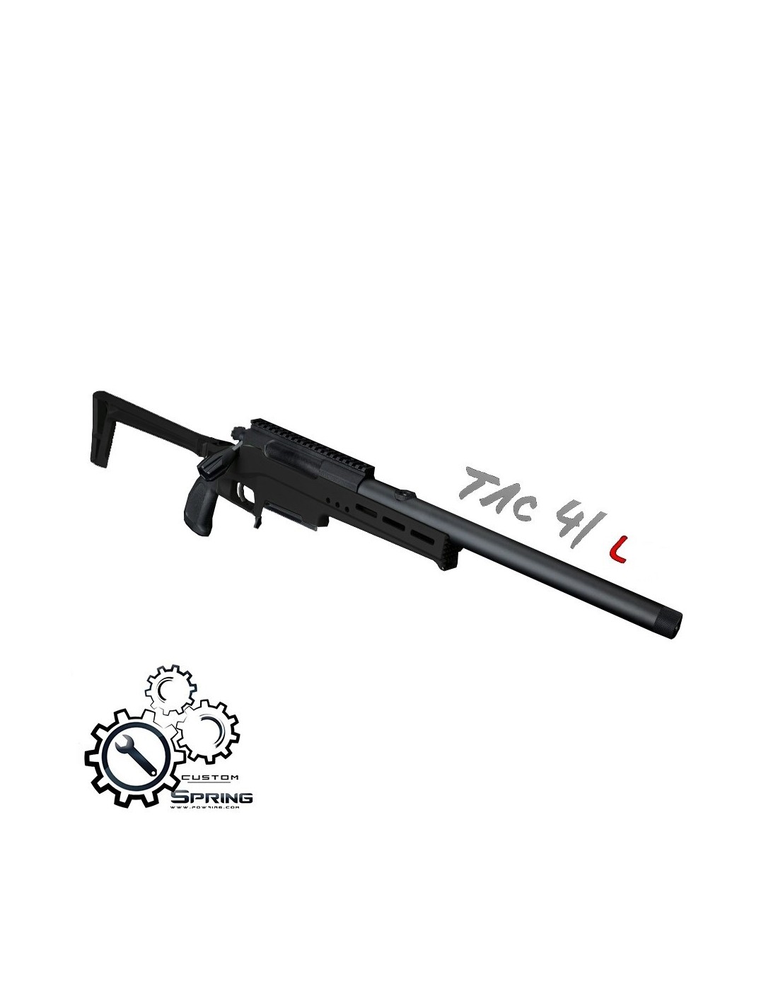 Upgraded TAC-41 Lite sniper airsoft rifle (aluminum body) by P6 Workshop. We chose this replica because it has a good upgrade base which allows us to put the best compatible internal parts while keeping replica base price reasonable. The TAC-41 Lite already factory include the Silverback metal hop-up unit.