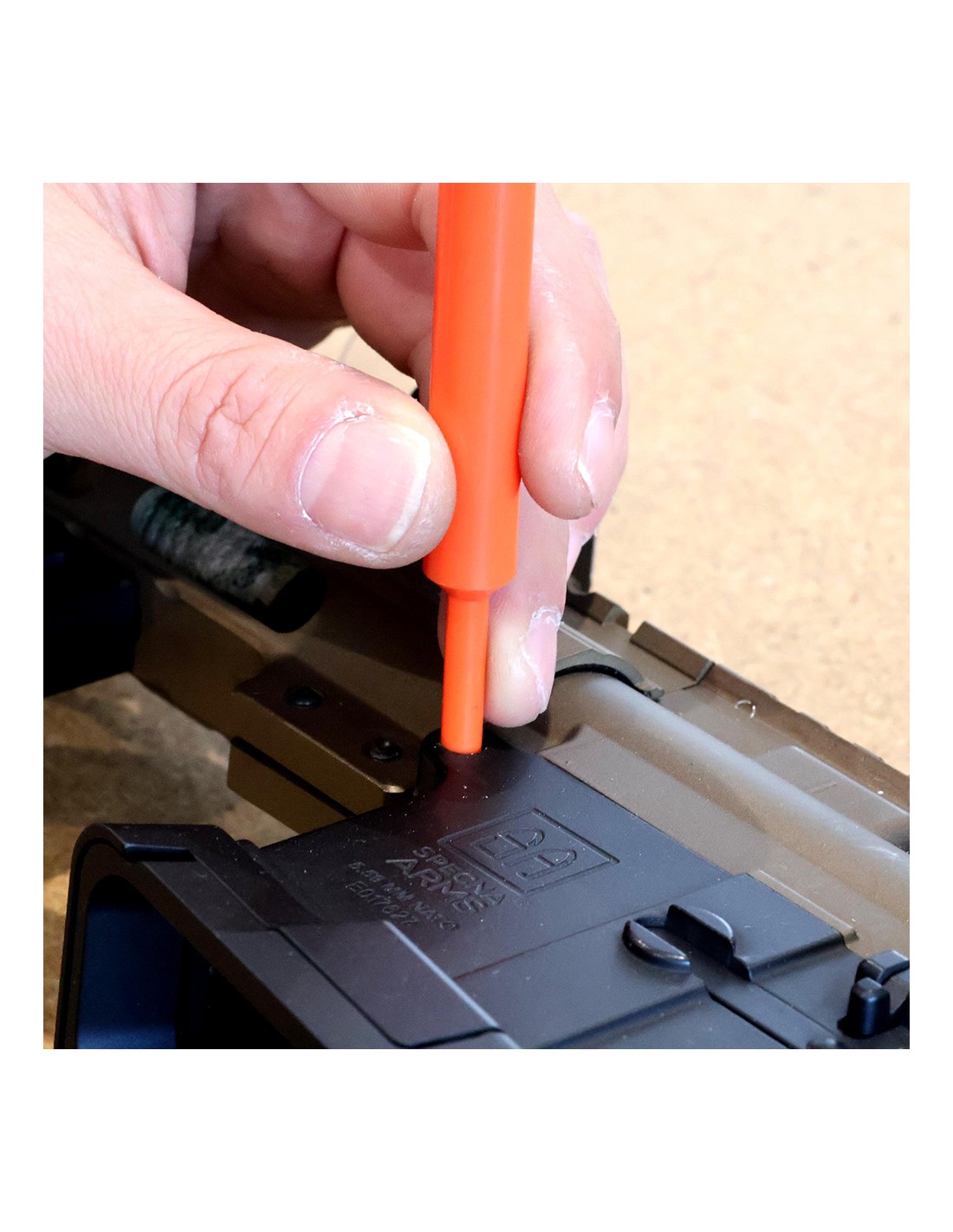 The Balystik molded POM pin punch is specifically designed for disassembling and maintaining AR-type replicas. Thanks to its engineering polymer construction, it allows for the extraction or insertion of pins without risking damage to parts or finishes.