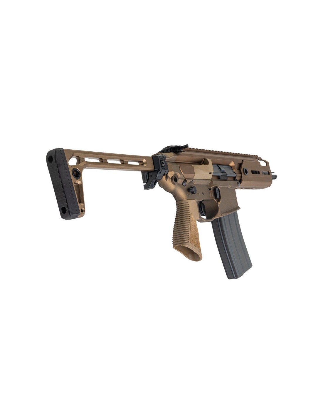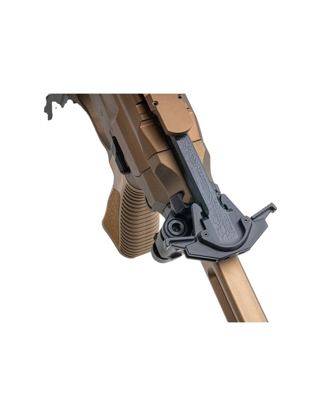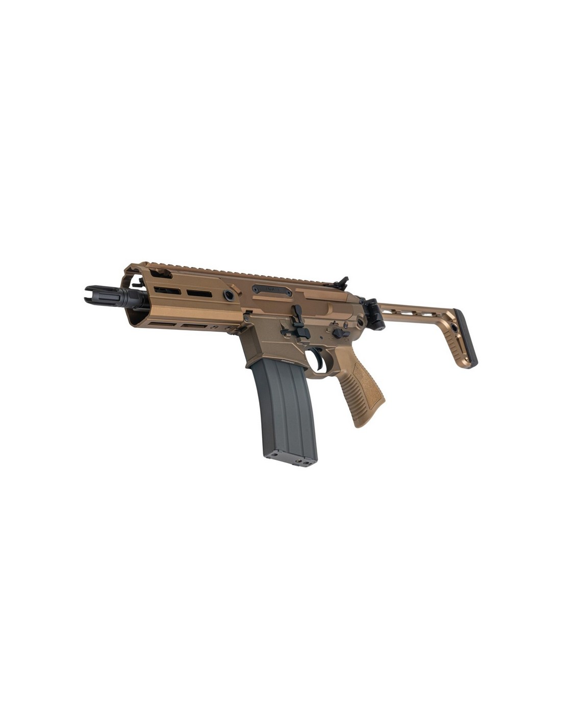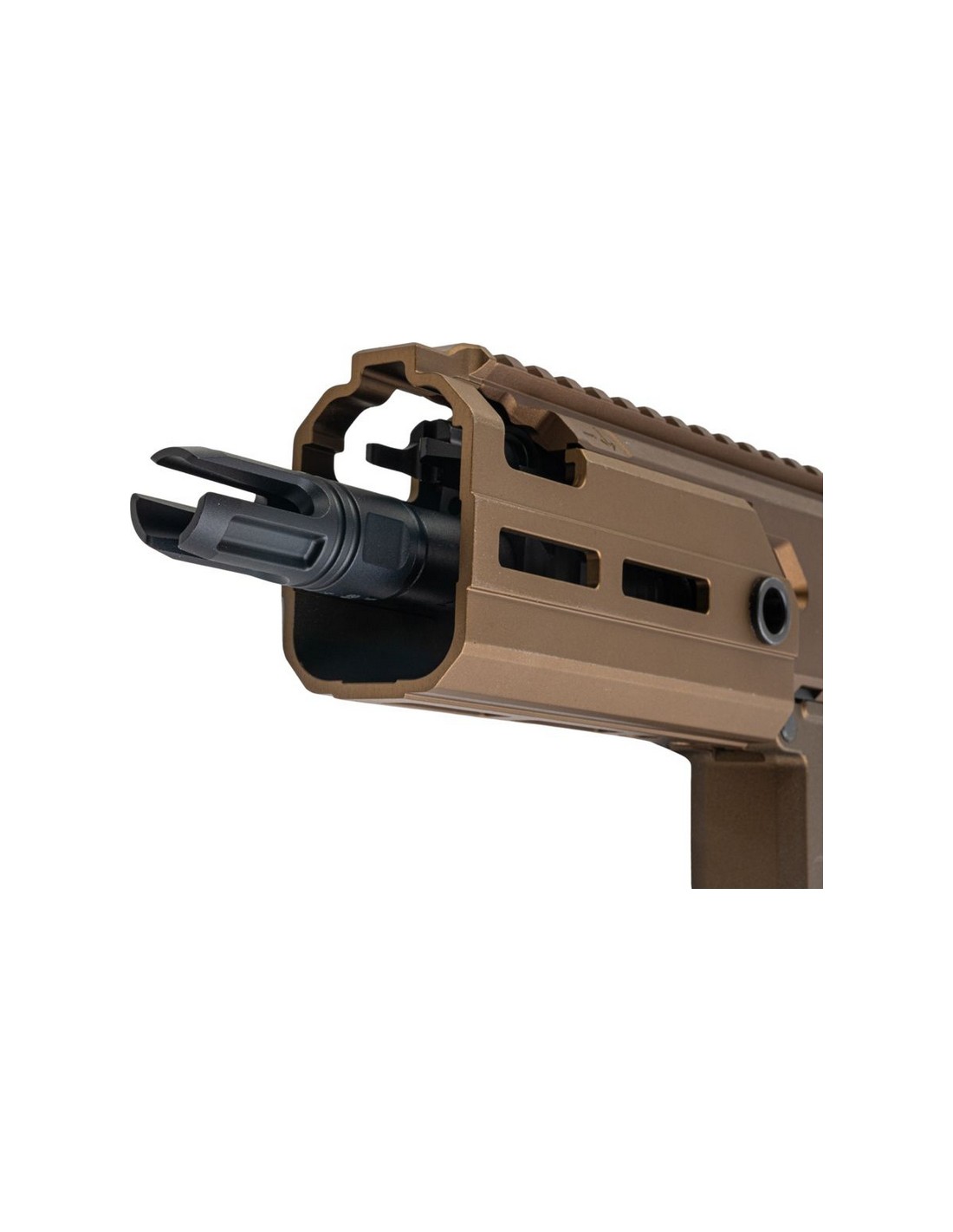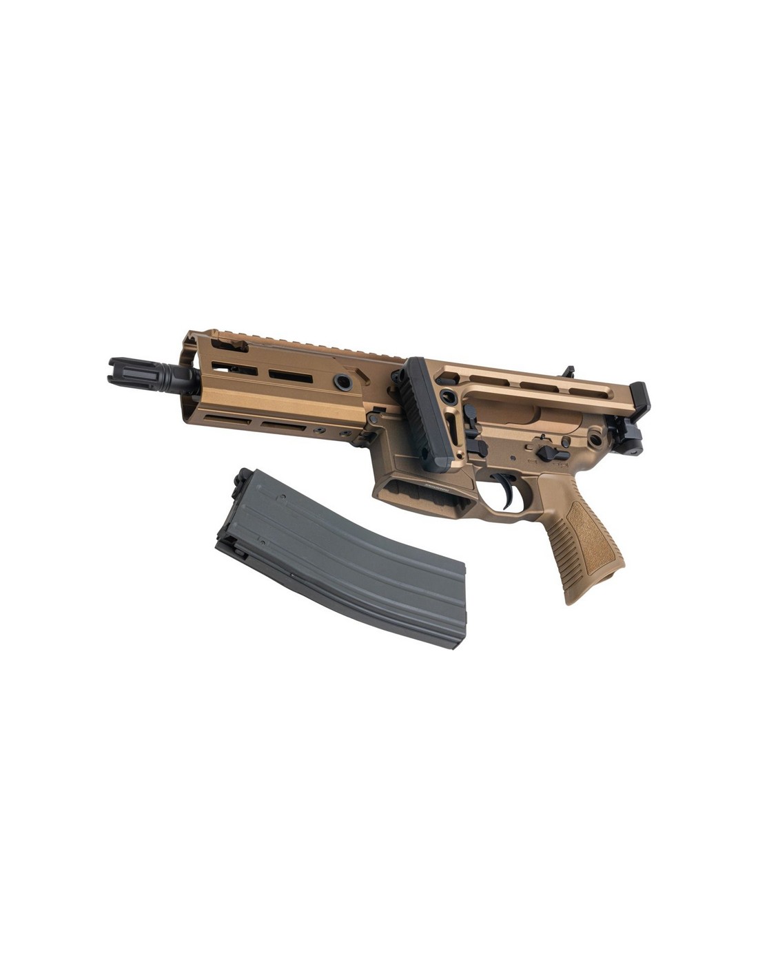 • Équipé d'une crosse pliable minimaliste en acier inoxydable, d'une poignée pistolet PDW unique et d'un cache-flamme QD conique à 3 branches
