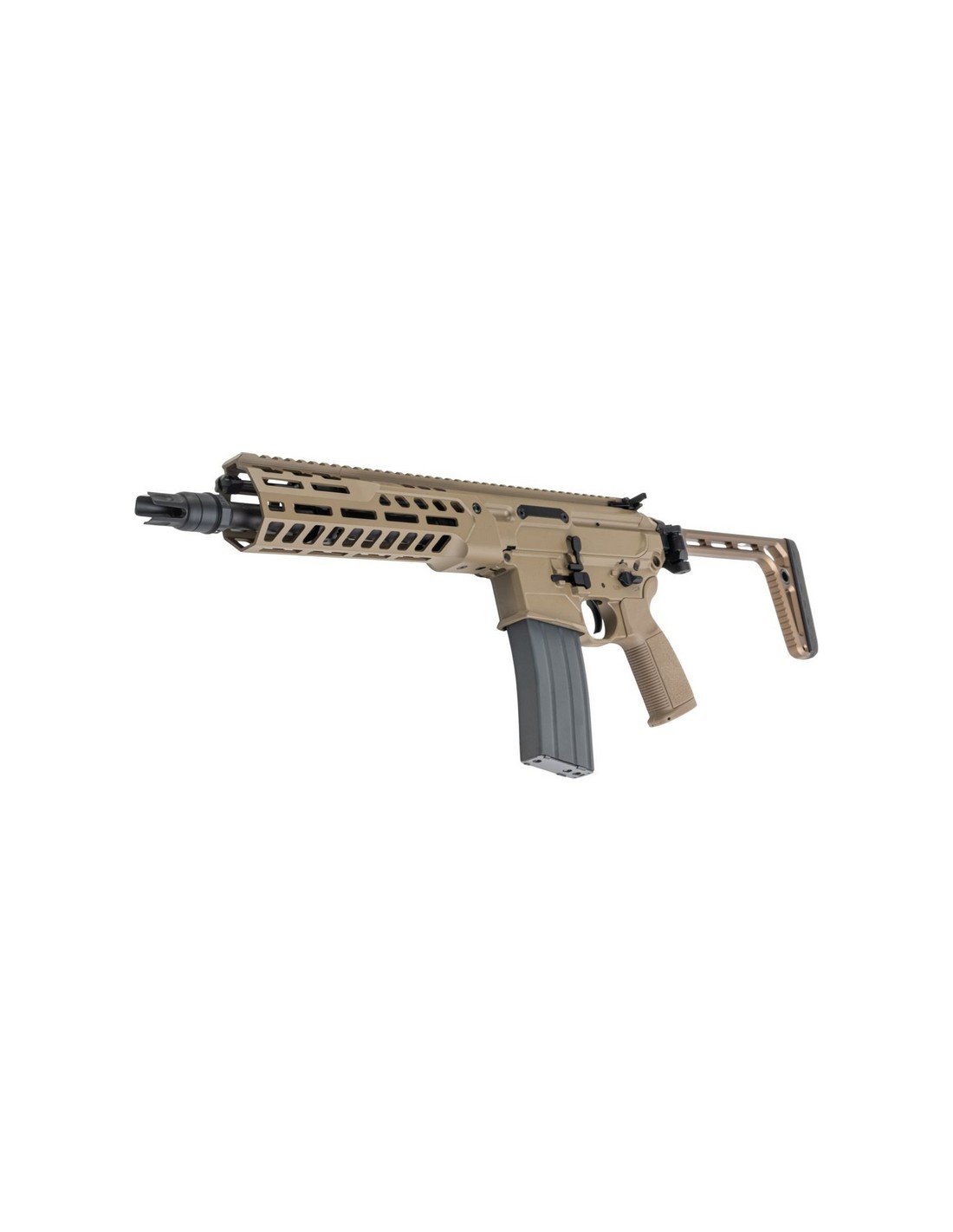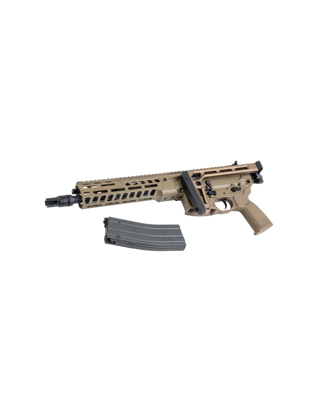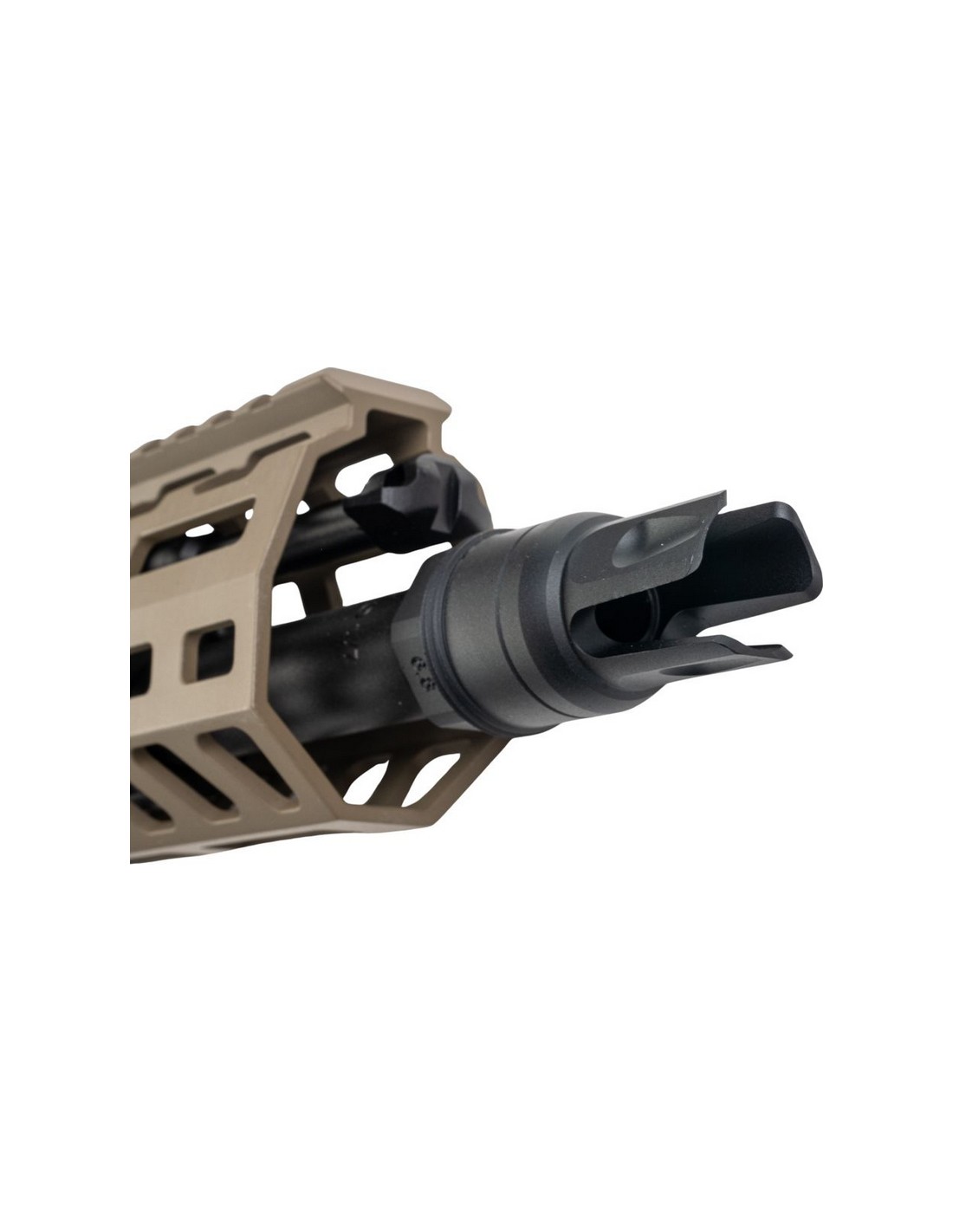 - Équipé d’une crosse pliante Minimalist SS et d’un cache‑flamme 3 dents Taper‑Lok QD