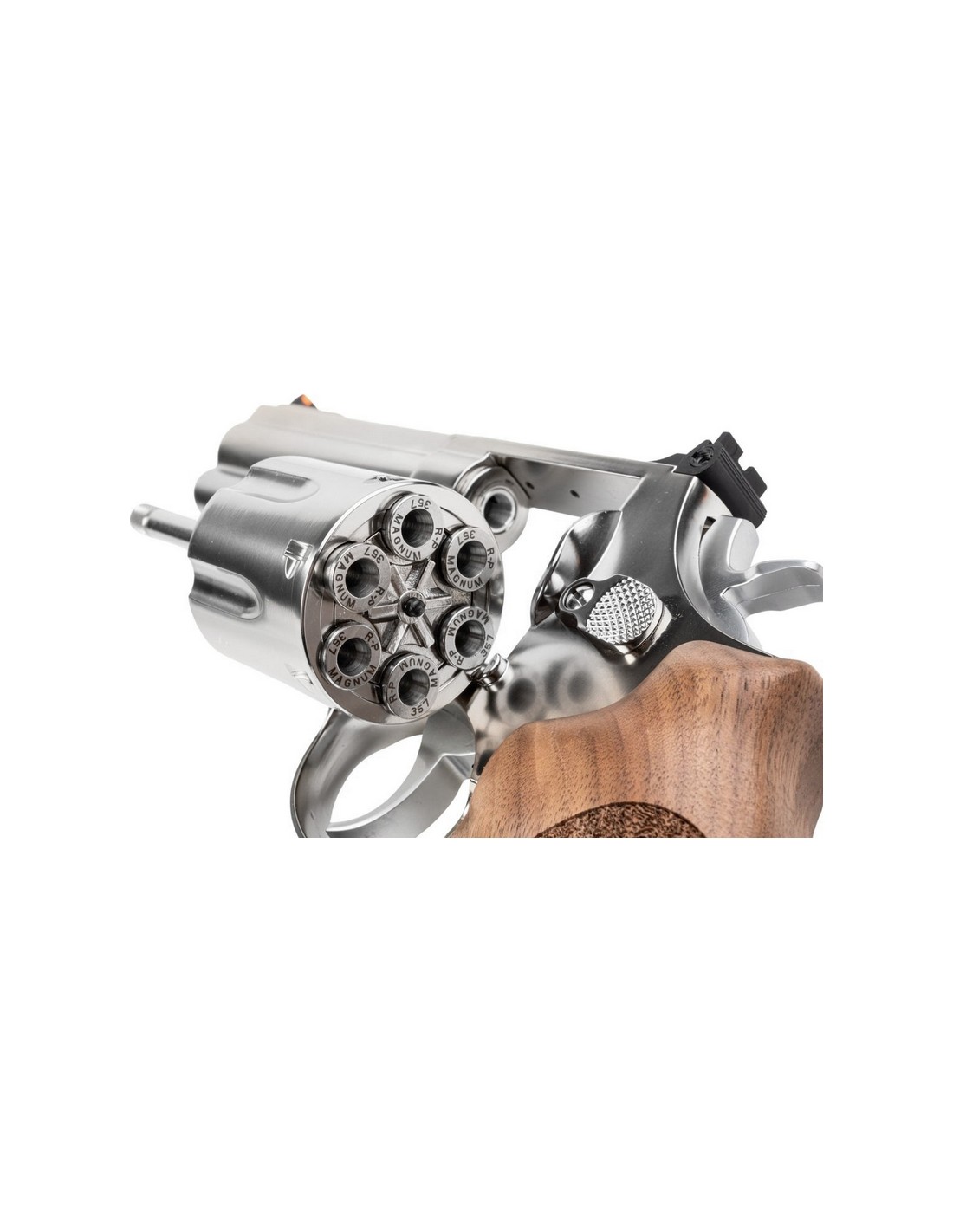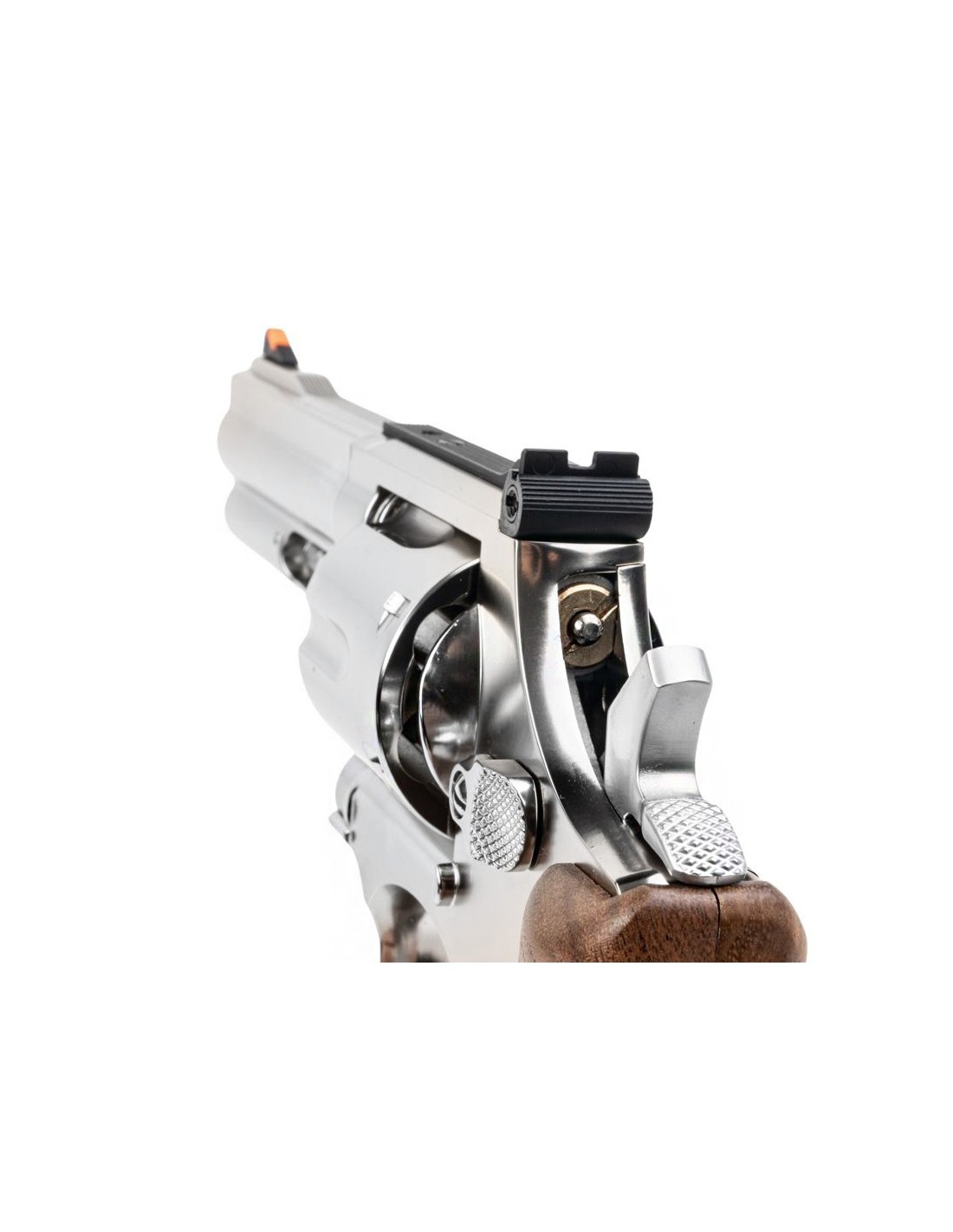 Ares a gardé ce que les amateurs de revolver aiment à propos des revolvers airsoft, les munitions amovibles, ces munitions sont fabriquées avec une attention particulière aux détails, bien que la pointe soit en caoutchouc, pour maintenir l'étanchéité du BB, juste en dessous il y a une pointe en cuivre et en dessous une douille en aluminium, le résultat est que chaque munition ressemble à une vraie balle creuse, et pour rendre le rechargement plus facile, un clip full moon est inclus avec les munitions permettant des rechargements faciles et plus rapides. Mais la cerise sur le gâteau du S&W 686 d'ARES est qu'il est livré avec des poignées en bois véritable texturé, pour ce niveau de prix, le bois véritable est presque inédit, sans parler de la texture, qui offre une prise en main à la fois agréable et confortable.