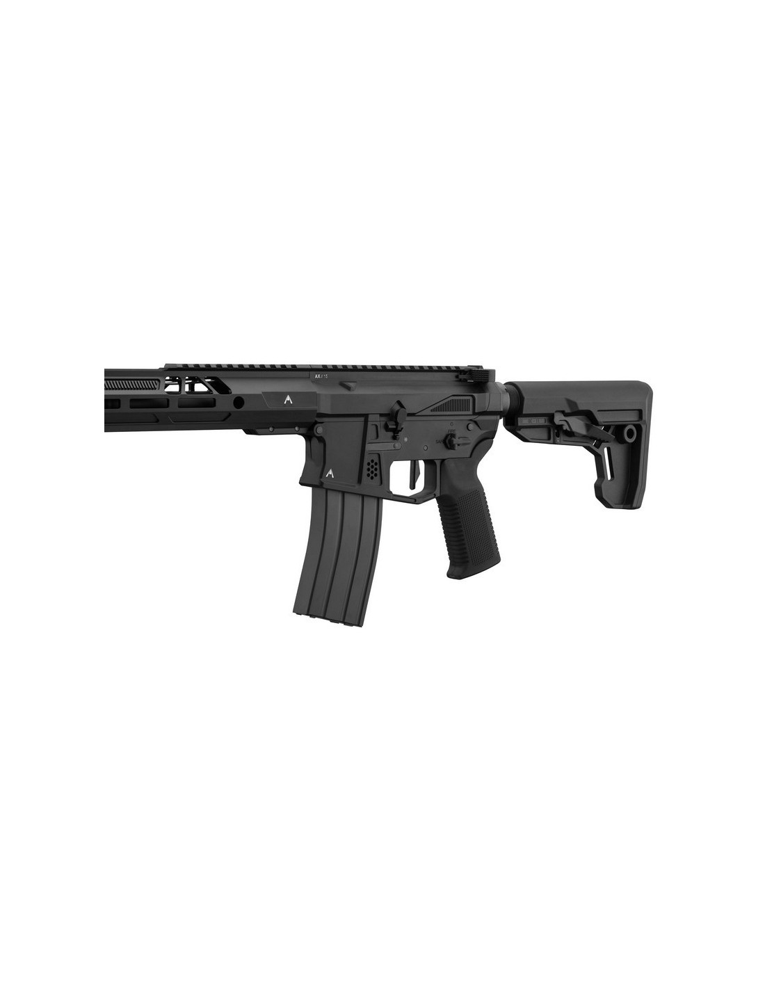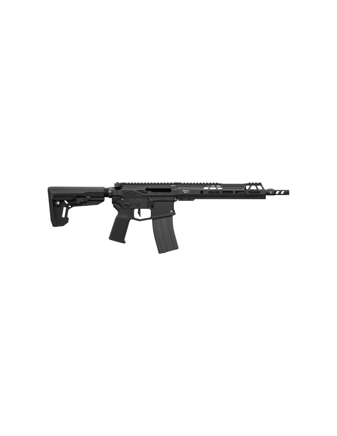 Cette réplique de type AR15/M4 est principalement construite en métal, assurant une robustesse accrue et une apparence réaliste. Le garde-main en aluminium, équipée d’un système de montage M-LOK, permet une fixation modulable d’accessoires tout en offrant une surface texturée pour une prise en main sécurisée. Le rail Picatinny intégré sur toute la longueur facilite l’installation d’équipements optiques ou autres accessoires tactiques. Le corps, doté d’un sélecteur de tir ambidextre, ainsi que le cache-flammes "Butterfly", sont également en aluminium, portant le marquage du logo Aeroknox.