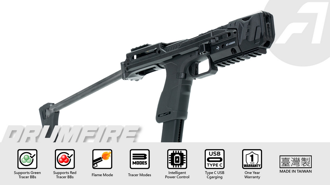 - Unité tracer Drumfire incluse, mode TRACER et FLAME, compatible billes traçantes rouges et vertes